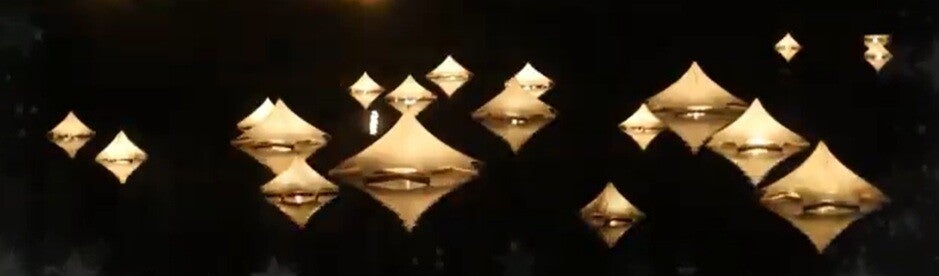 Als de oever niet weerspiegelt lijken de lampionnen te zweven...
